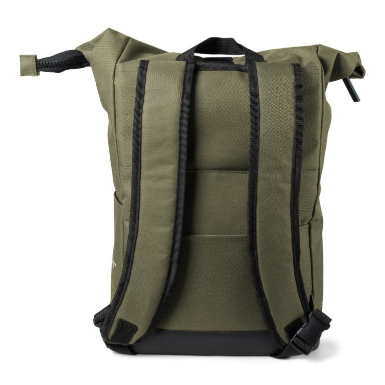 De bovenzijde van de tas is oprolbaar en afgewerkt met een vegan lederen bodem. Hierdoor kun je de inhoud eenvoudig aanpassen aan de hoeveelheid spullen die je meeneemt.