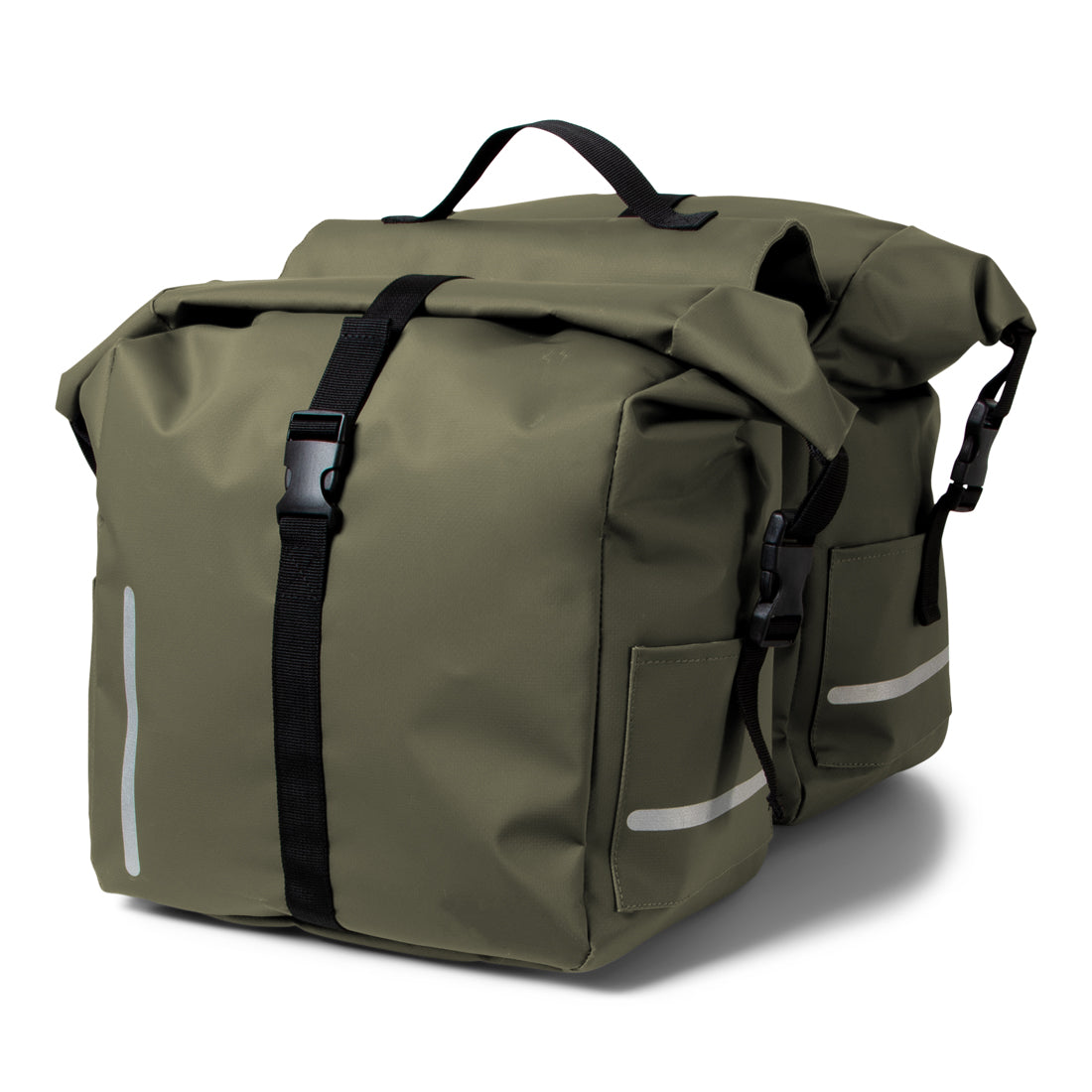 De Norlander Tarpaulin Dubbele Fietstas Groen is een praktische en ruime dubbele fietstas voor op de bagagedrager. Ideaal voor boodschappen, woon-werk verkeer of een dagje fietsen. Dankzij het stevige tarpaulin materiaal, de waterafstotende eigenschappen en de reflectiestrepen neem je je spullen veilig en comfortabel mee. Met de handige klittenband bevestiging plaats je de fietstas eenvoudig op vrijwel iedere fiets of e-bike.