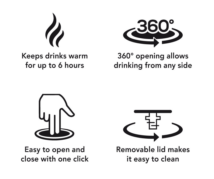 Het 360° drinkdeksel maakt het nóg makkelijker: je hoeft de beker niet te draaien om het drinkgaatje te vinden. Waar je ook drinkt, de ervaring is altijd hetzelfde. Handig, slim en gemaakt om jouw dag soepeler te laten verlopen.
